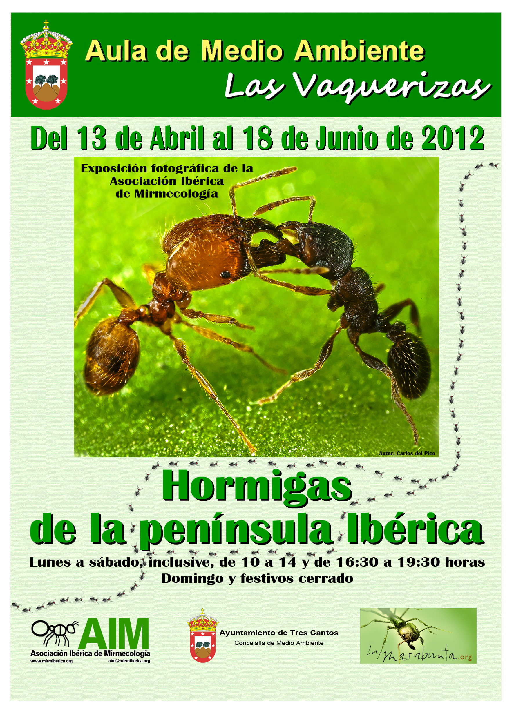 La AIM, por medio de uno de nuestros socios, vecino del municipio, se puso en contacto con su anterior alcalde, José Folgado, y con el Concejal de Medio Ambiente, Jesús Serrada, para ofrecerles la posibilidad de que nuestra exposición recalase en ese Aula, como preludio del VII Congreso Ibérico de Mirmecología “Taxomara” que se celebraría en Tres Cantos en el verano de 2012.