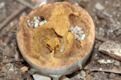 Crematogaster scutellaris. Interior del nido, en la agalla, lleno de larvas