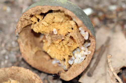 Crematogaster scutellaris. Interior del nido, en la agalla, lleno de larvas (la otra mitad)
