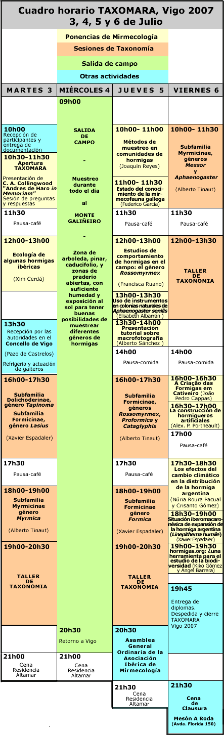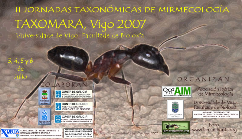 Teniendo en cuenta que las anteriores jornadas de Taxomara 2006 organizadas por Lamarabunta.org en el Zoobotánico de Jerez de La Frontera, tuvo como principal objetivo proporcionar nociones básicas de taxonomía e identificación de los géneros de las diferentes subfamilias que componen los Formicidae ibéricos y de su conservación en colecciones entomológicas, estas II Jornadas Taxonómicas de Mirmecología. TAXOMARA, Vigo 2007 tendrán como principal objetivo el dar prioridad al acercamiento a tres grupos genéricos muy comunes en la mirmecofauna de Galiza como son los géneros Tapinoma (Dolichoderinae), Formica y Lasius (Formicinae).