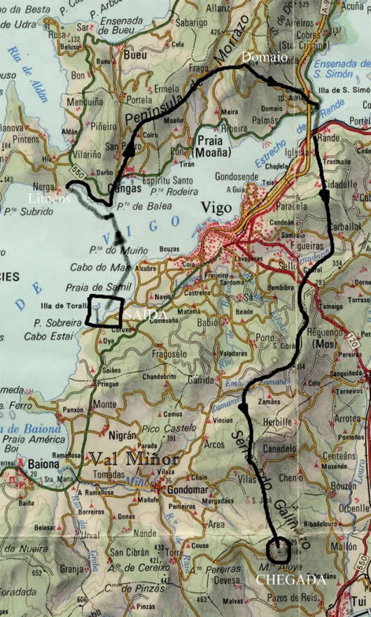 Desde la Plaza de la Iglesia nos dirigiremos por la Puerta de Gamboa, Plaza de Compostela y Calle Real hasta desembocar en la Estación Marítima de Ría, donde podemos visitar los restos del antiguo muelle de A Laxe. Desde la Estación Marítima, salen numerosas excursiones marítimas para conocer la ría y las Islas Cíes.