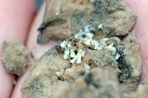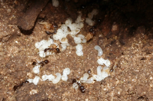 Aphaenogaster. Nido con larvas y pupas.
