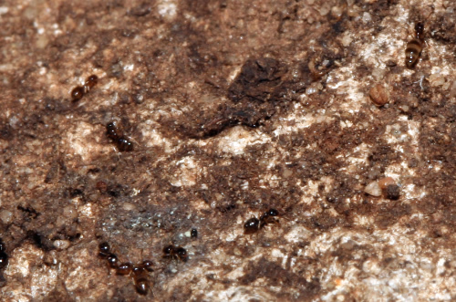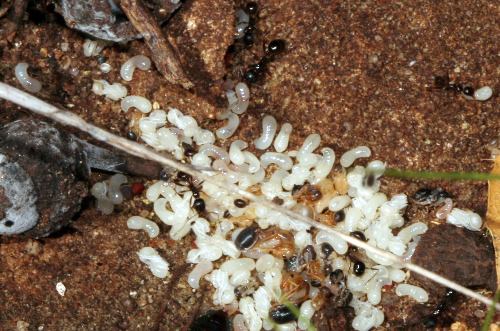 Tapinoma. Nido con larvas, debajo de madera seca.