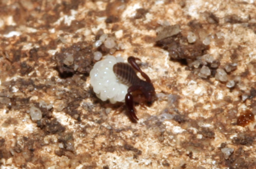 Pseudoescorpion. Pelota de huevos debajo de una piedra.