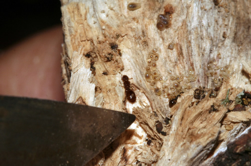 Temnothorax. Dentro de un tronco seco, reina y larvas.