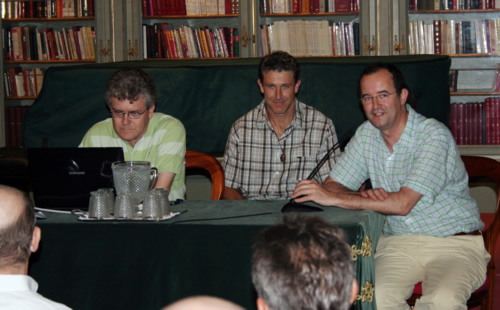 El conferenciante, Dr. Joaquín Reyes (AIM – Universidad de Córdoba), a mano izquierda de la foto. En medio, Gerardo Fernández (Presidente de la AIM). A la derecha, Don Ignacio Herrera, Director General de la Real Maestranza
